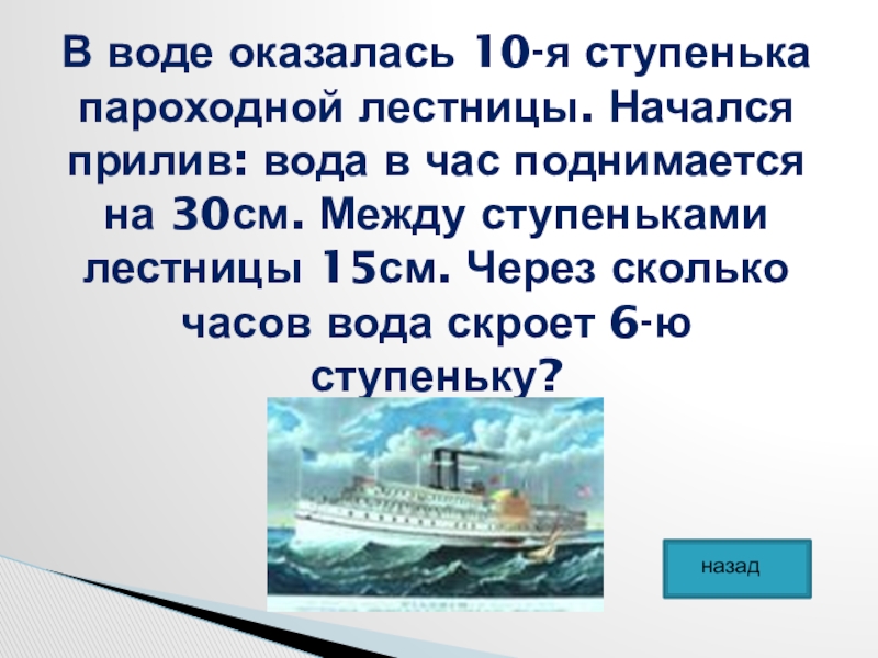 Слайд 26В воде оказалась 10-я ступенька пароходной лестницы. Начался прилив: вода в