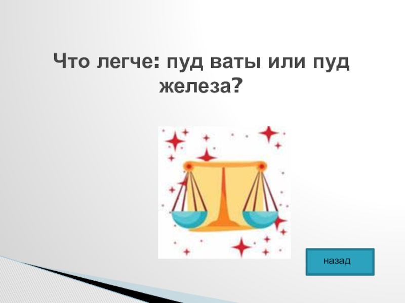 Слайд 29Что легче: пуд ваты или пуд железа?