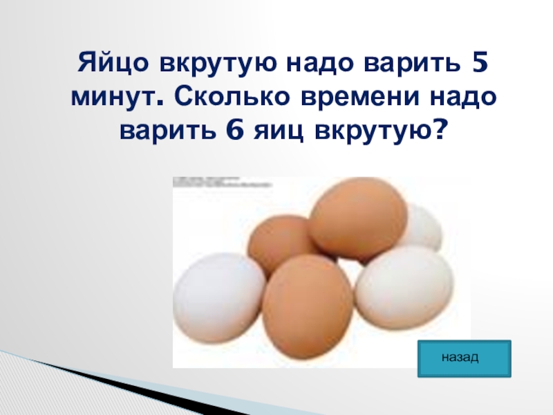 Слайд 27Яйцо вкрутую надо варить 5 минут. Сколько времени надо варить 6