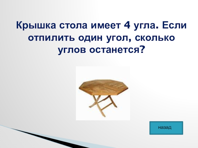 Слайд 24Крышка стола имеет 4 угла. Если отпилить один угол, сколько углов