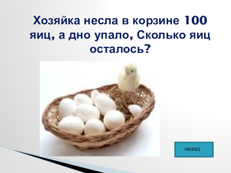 Слайд 23Хозяйка несла в корзине 100 яиц, а дно упало, Сколько яиц