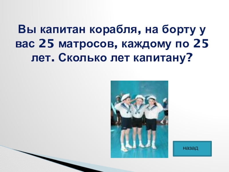 Вы капитан корабля, на борту у вас 25 матросов, каждому по 25 лет. Сколько лет капитану?