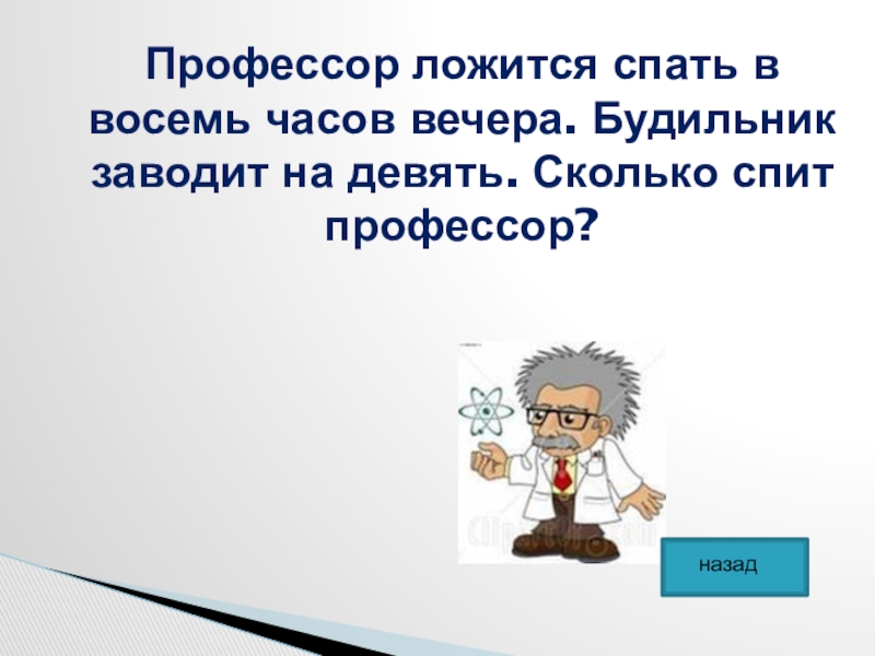 Слайд 28Профессор ложится спать в восемь часов вечера. Будильник заводит на девять.