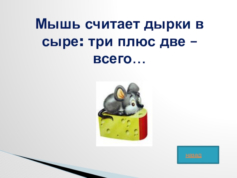 Слайд 45Мышь считает дырки в сыре: три плюс две – всего…