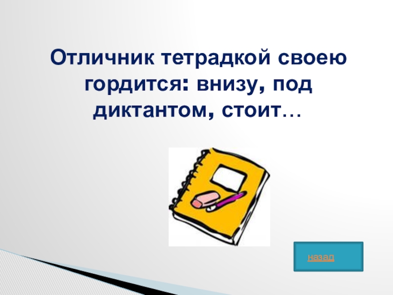 Слайд 42Отличник тетрадкой своею гордится: внизу, под диктантом, стоит…