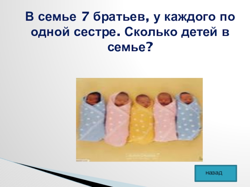 Слайд 31В семье 7 братьев, у каждого по одной сестре. Сколько детей
