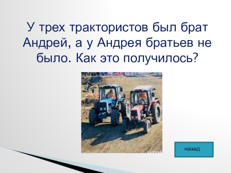 Слайд 20У трех трактористов был брат Андрей, а у Андрея братьев не