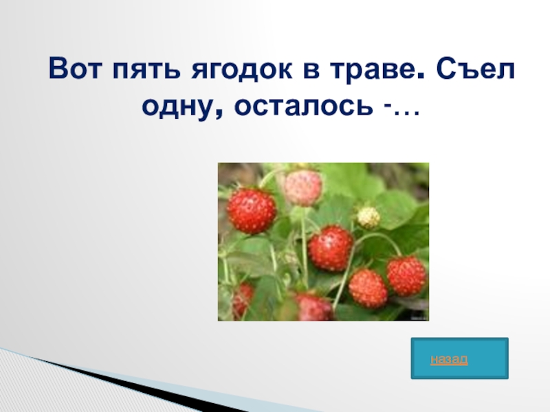 Слайд 44Вот пять ягодок в траве. Съел одну, осталось -…