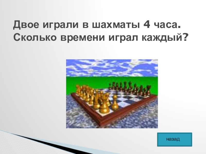 Слайд 32Двое играли в шахматы 4 часа. Сколько времени играл каждый?
