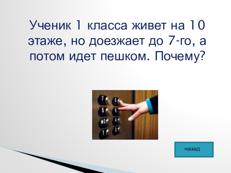 Слайд 19Ученик 1 класса живет на 10 этаже, но доезжает до 7-го,