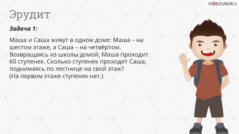 шестом этаже, а Саша – на четвёртом. Возвращаясь из школы домой, Маша проходит 60 ступенек. Сколько ступенек проходит Саша, поднимаясь по лестнице на свой этаж?