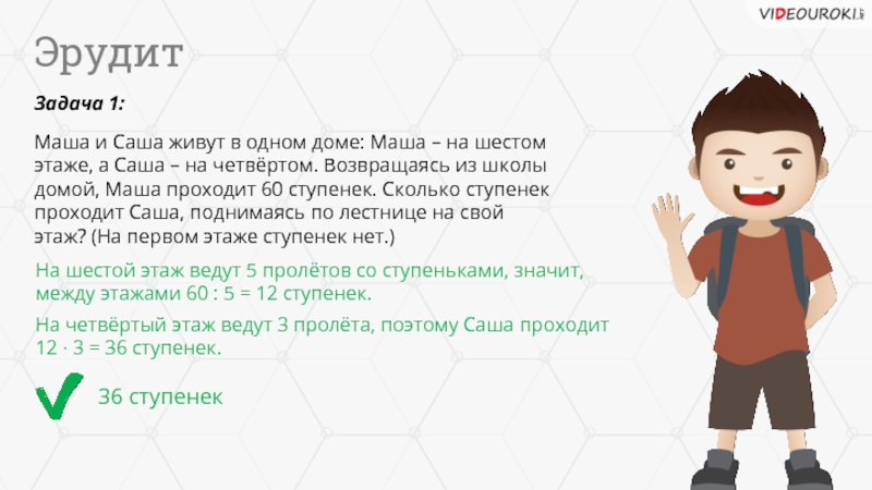На четвёртый этаж ведут 3 пролёта, поэтому Саша проходит 12 ∙ 3 = 36 ступенек.