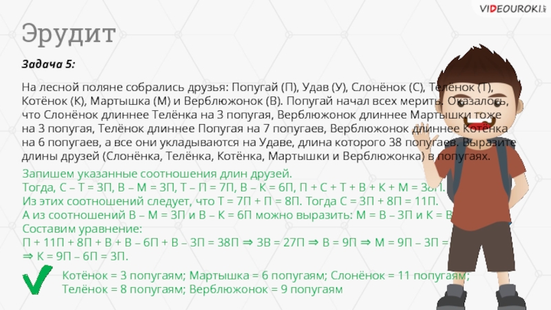 на 6 попугаев, а все они укладываются на Удаве, длина которого 38 попугаев. Выразите длины друзей (Слонёнка, Телёнка, Котёнка, Мартышки и Верблюжонка) в попугаях.