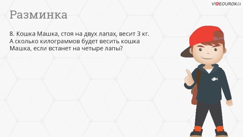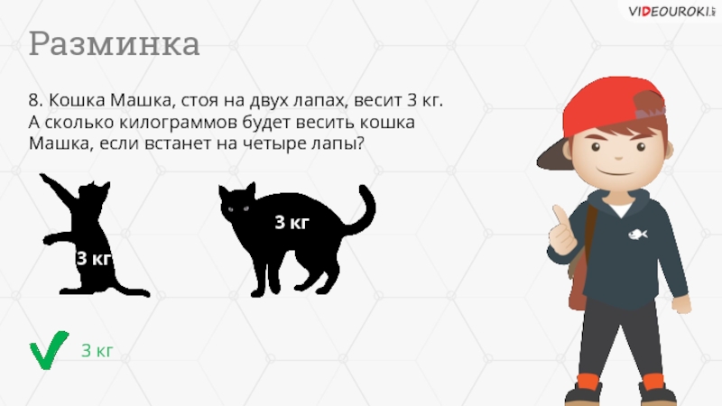 8. Кошка Машка, стоя на двух лапах, весит 3 кг.