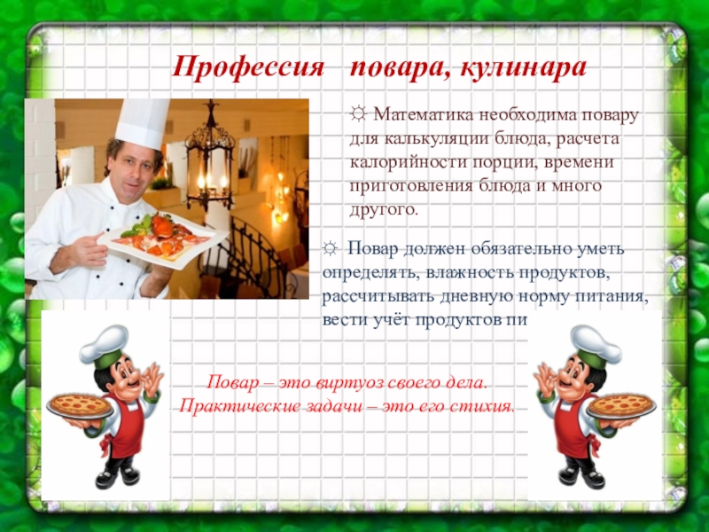 ☼ Повар должен обязательно уметь определять, влажность продуктов, рассчитывать дневную норму питания, вести учёт продуктов питания