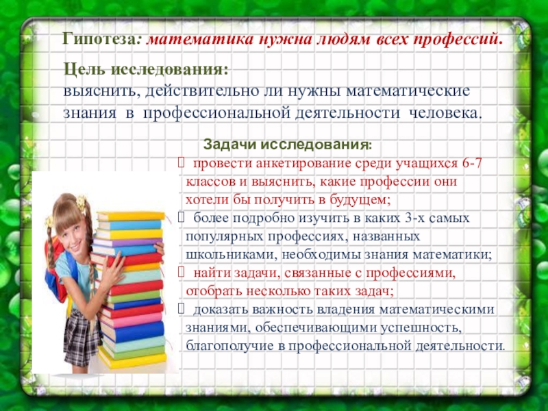 Цель исследования: выяснить, действительно ли нужны математические знания в профессиональной деятельности человека.