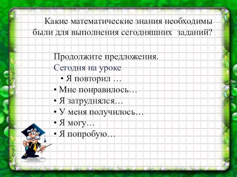 • Я повторил … • Мне понравилось… • Я затруднялся… • У меня получилось… • Я могу… • Я попробую…