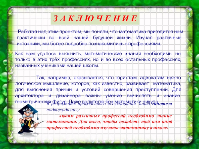 Работая над этим проектом, мы поняли, что математика пригодится нам практически во всей нашей будущей жизни. Изучая различные источники, мы более подробно познакомились с профессиями.