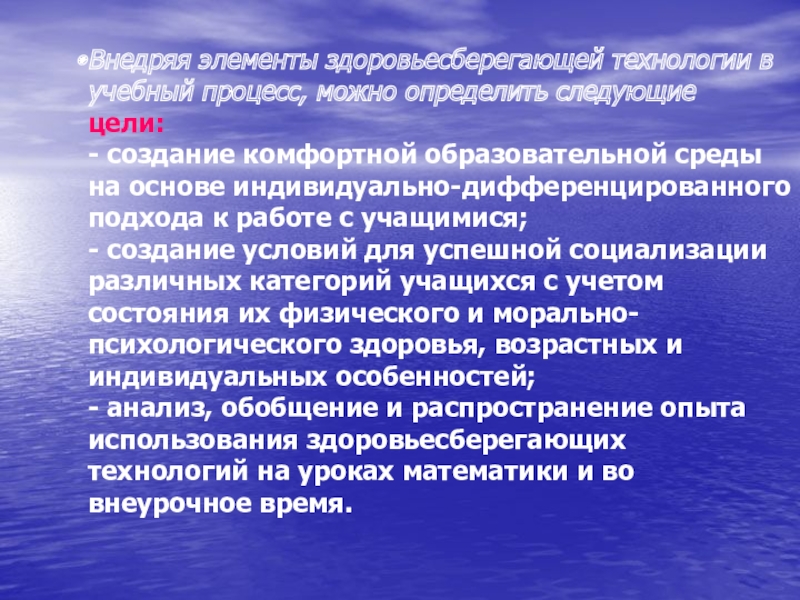 комфортной образовательной среды на основе индивидуально-дифференцированного подхода к работе с учащимися; - создание условий для успешной социализации различных категорий учащихся с учетом состояния их физического и морально-психологического здоровья, возрастных и индивидуальных особенностей; - анализ, обобщение и распространение опыта использования здоровьесберегающих технологий на уроках математики и во внеурочное время.
