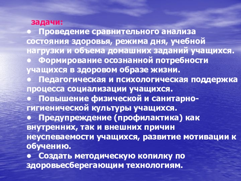 задачи: •   Проведение сравнительного анализа состояния здоровья, режима дня, учебной нагрузки и объема домашних заданий