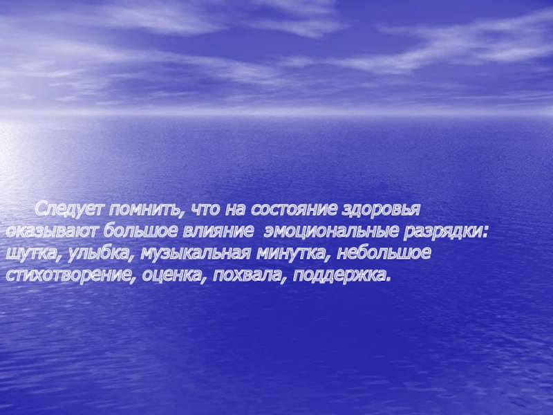 что на состояние здоровья оказывают большое влияние  эмоциональные разрядки: шутка, улыбка, музыкальная минутка, небольшое стихотворение, оценка, похвала, поддержка.