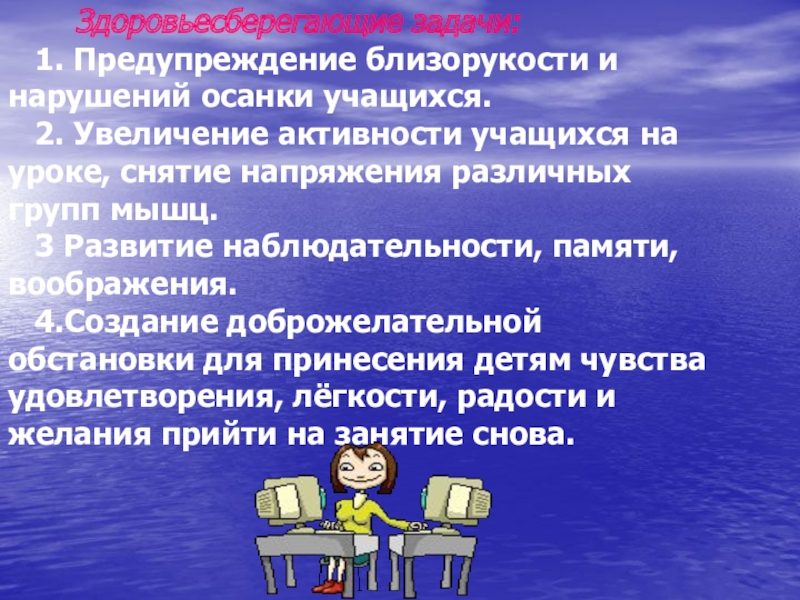 Здоровьесберегающие задачи:    1. Предупреждение близорукости и нарушений осанки учащихся.