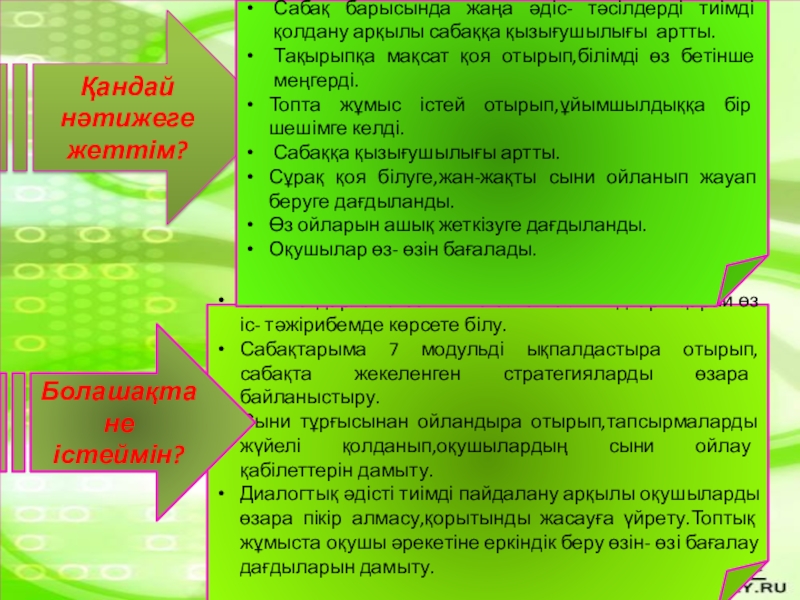 Топтық қарым- қатынас жасай отырып,білімді өздігінен алады.