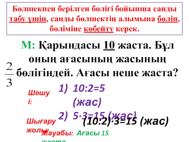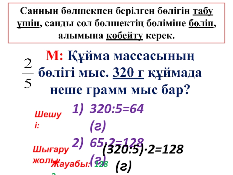 Санның бөлшекпен берілген бөлігін табу үшін, санды сол бөлшектің бөліміне бөліп, алымына көбейту керек.