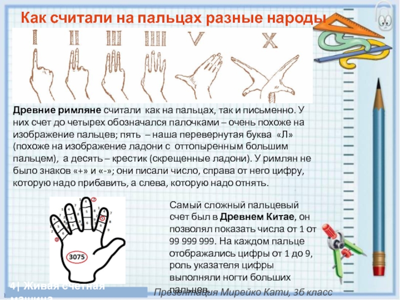 Древние римляне считали как на пальцах, так и письменно. У них счет до четырех обозначался палочками – очень похоже на изображение пальцев; пять – наша перевернутая буква «Л» (похоже на изображение ладони с оттопыренным большим пальцем), а десять – крестик (скрещенные ладони). У римлян не было знаков «+» и «-»; они писали число, справа от него цифру, которую надо прибавить, а слева, которую надо отнять.