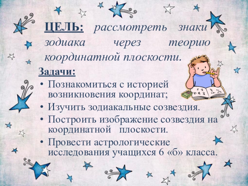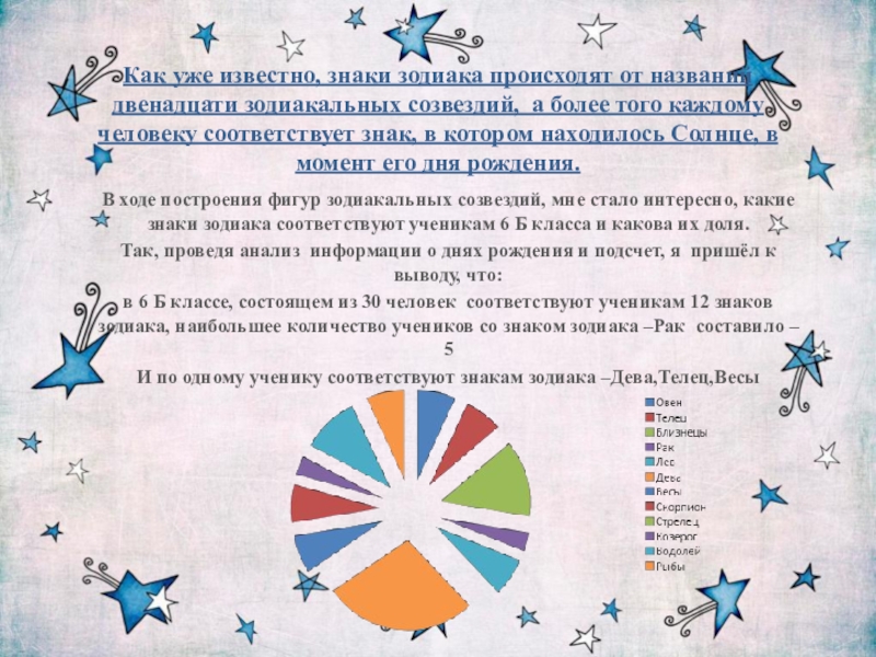 В ходе построения фигур зодиакальных созвездий, мне стало интересно, какие знаки зодиака соответствуют ученикам 6 Б класса и какова их доля.