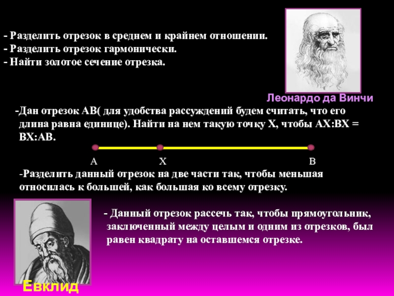 -Разделить данный отрезок на две части так, чтобы меньшая относилась к большей, как большая ко всему отрезку.