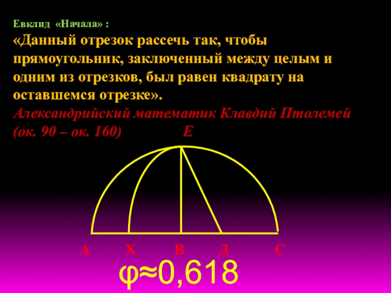 Дан отрезок АВ( для удобства рассуждений будем считать, что его длина равна единице). Найти на нем такую точку Х, чтобы АХ:ВХ = ВХ:АВ.