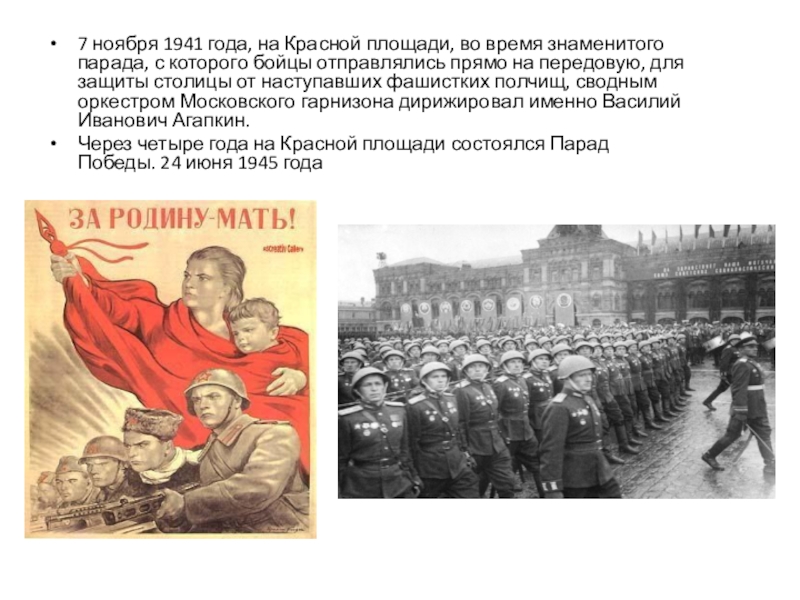 с которого бойцы отправлялись прямо на передовую, для защиты столицы от наступавших фашистких полчищ, сводным оркестром Московского гарнизона дирижировал именно Василий Иванович Агапкин.