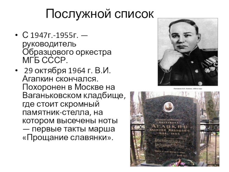 1964 г. В.И. Агапкин скончался. Похоронен в Москве на Ваганьковском кладбище, где стоит скромный памятник-стелла, на котором высечены ноты — первые такты марша «Прощание славянки».