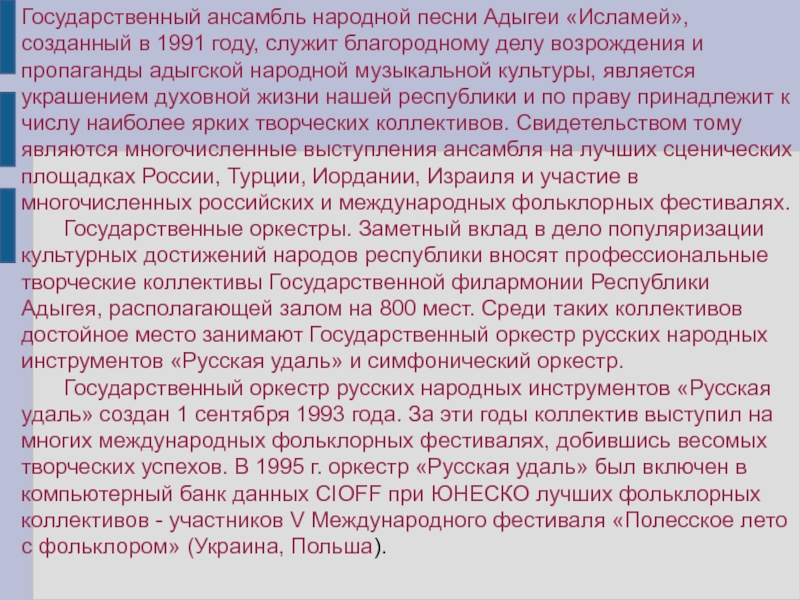 Слайд 31Государственный ансамбль народной песни Адыгеи «Исламей», созданный в 1991 году, служит