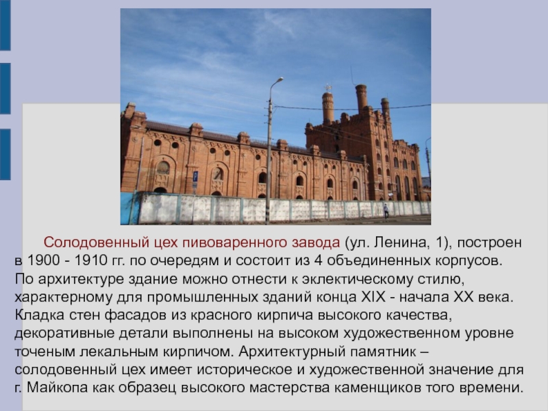 - 1910 гг. по очередям и состоит из 4 объединенных корпусов. По архитектуре здание можно отнести к эклектическому стилю, характерному для промышленных зданий конца XIX - начала XX века. Кладка стен фасадов из красного кирпича высокого качества, декоративные детали выполнены на высоком художественном уровне точеным лекальным кирпичом. Архитектурный памятник – солодовенный цех имеет историческое и художественной значение для г. Майкопа как образец высокого мастерства каменщиков того времени.