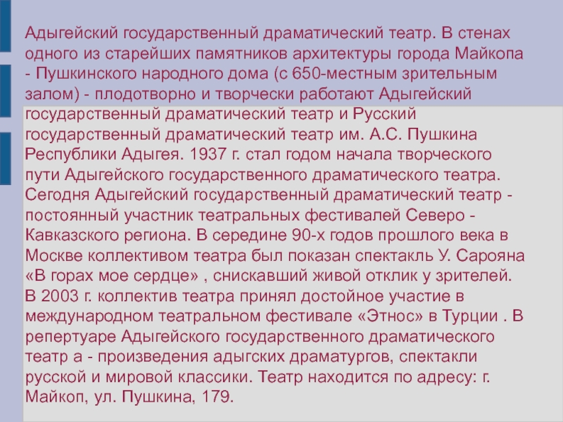 города Майкопа - Пушкинского народного дома (с 650-местным зрительным залом) - плодотворно и творчески работают Адыгейский государственный драматический театр и Русский государственный драматический театр им. А.С. Пушкина Республики Адыгея. 1937 г. стал годом начала творческого пути Адыгейского государственного драматического театра. Сегодня Адыгейский государственный драматический театр - постоянный участник театральных фестивалей Северо - Кавказского региона. В середине 90-х годов прошлого века в Москве коллективом театра был показан спектакль У. Сарояна «В горах мое сердце» , снискавший живой отклик у зрителей. В 2003 г. коллектив театра принял достойное участие в международном театральном фестивале «Этнос» в Турции . В репертуаре Адыгейского государственного драматического театр а - произведения адыгских драматургов, спектакли русской и мировой классики. Театр находится по адресу: г. Майкоп, ул. Пушкина, 179.