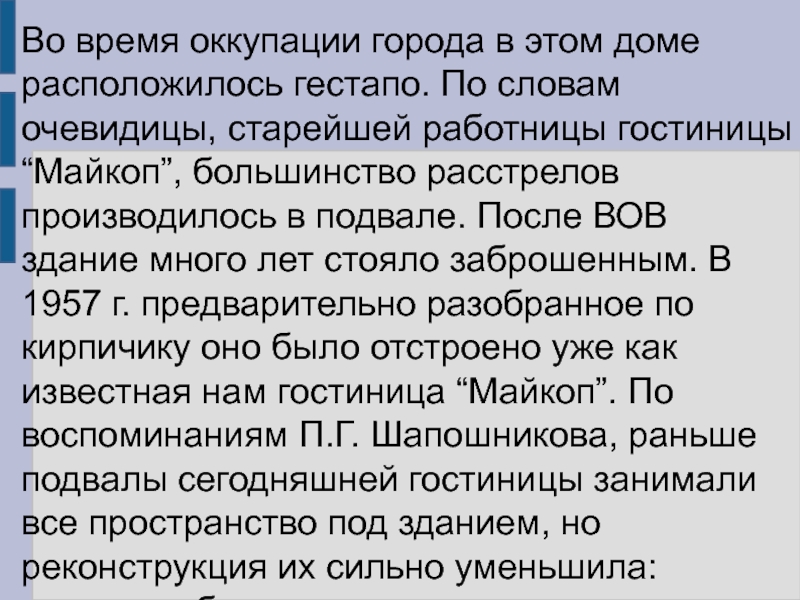 очевидицы, старейшей работницы гостиницы “Майкоп”, большинство расстрелов производилось в подвале. После ВОВ здание много лет стояло заброшенным. В 1957 г. предварительно разобранное по кирпичику оно было отстроено уже как известная нам гостиница “Майкоп”. По воспоминаниям П.Г. Шапошникова, раньше подвалы сегодняшней гостиницы занимали все пространство под зданием, но реконструкция их сильно уменьшила: коридоры были засыпаны или заложены.