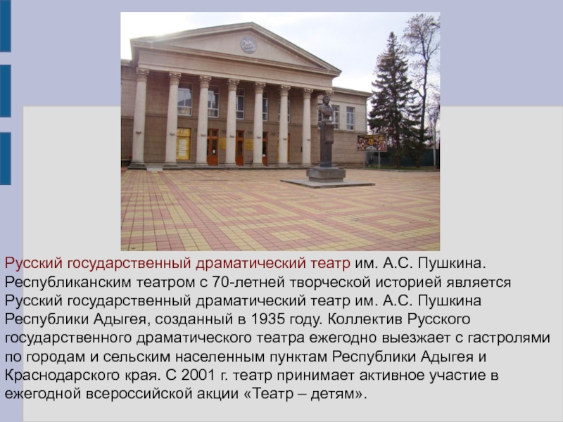 Слайд 34Русский государственный драматический театр им. А.С. Пушкина. Республиканским театром с 70-летней