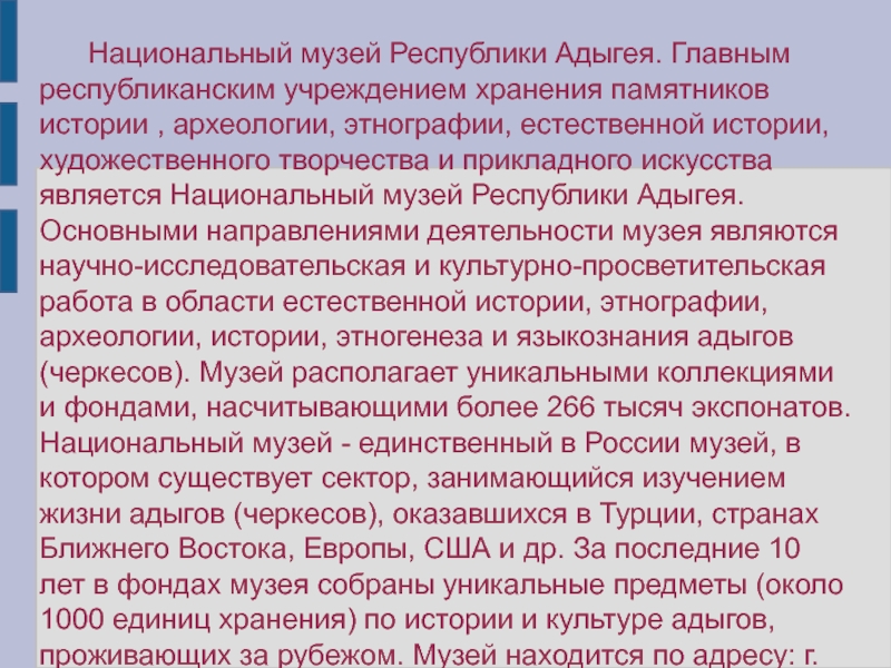Слайд 24 Национальный музей Республики Адыгея. Главным республиканским учреждением хранения памятников истории