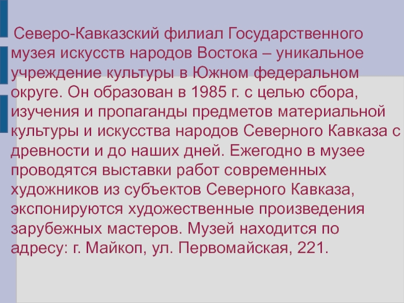культуры в Южном федеральном округе. Он образован в 1985 г. с целью сбора, изучения и пропаганды предметов материальной культуры и искусства народов Северного Кавказа с древности и до наших дней. Ежегодно в музее проводятся выставки работ современных художников из субъектов Северного Кавказа, экспонируются художественные произведения зарубежных мастеров. Музей находится по адресу: г. Майкоп, ул. Первомайская, 221.