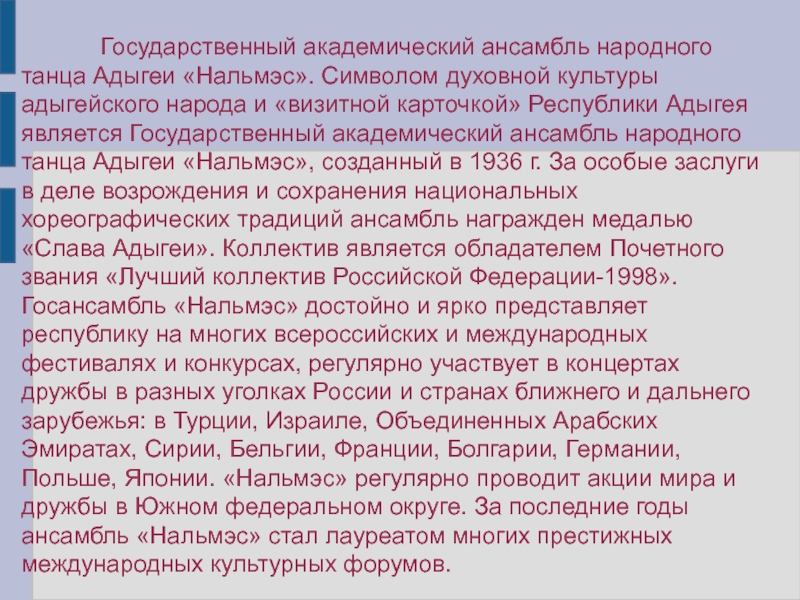 культуры адыгейского народа и «визитной карточкой» Республики Адыгея является Государственный академический ансамбль народного танца Адыгеи «Нальмэс», созданный в 1936 г. За особые заслуги в деле возрождения и сохранения национальных хореографических традиций ансамбль награжден медалью «Слава Адыгеи». Коллектив является обладателем Почетного звания «Лучший коллектив Российской Федерации-1998». Госансамбль «Нальмэс» достойно и ярко представляет республику на многих всероссийских и международных фестивалях и конкурсах, регулярно участвует в концертах дружбы в разных уголках России и странах ближнего и дальнего зарубежья: в Турции, Израиле, Объединенных Арабских Эмиратах, Сирии, Бельгии, Франции, Болгарии, Германии, Польше, Японии. «Нальмэс» регулярно проводит акции мира и дружбы в Южном федеральном округе. За последние годы ансамбль «Нальмэс» стал лауреатом многих престижных международных культурных форумов.