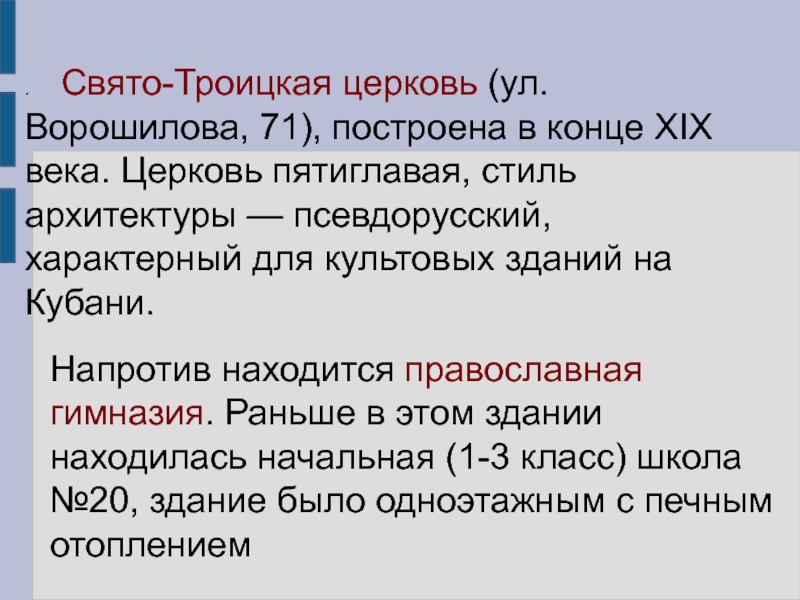Слайд 39. Свято-Троицкая церковь (ул. Ворошилова, 71), построена в конце XIX века. Церковь
