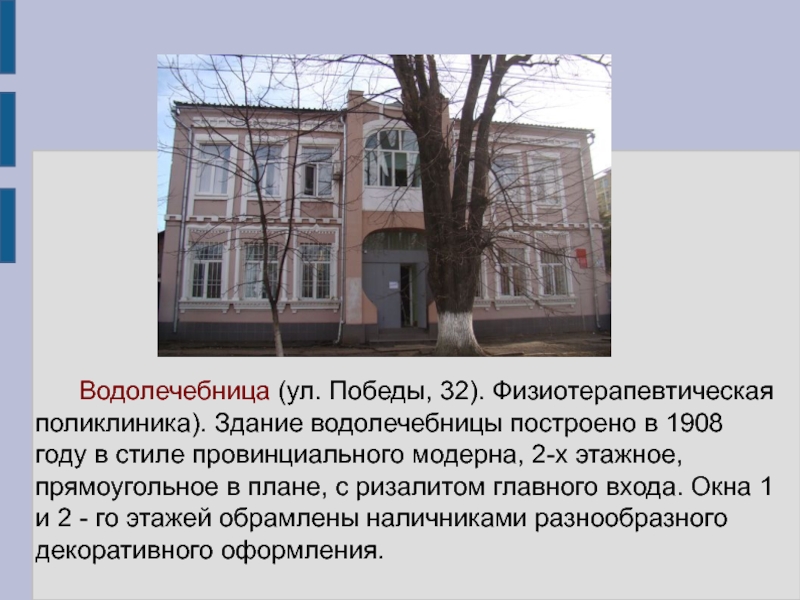 Слайд 10 Водолечебница (ул. Победы, 32). Физиотерапевтическая поликлиника). Здание водолечебницы построено в