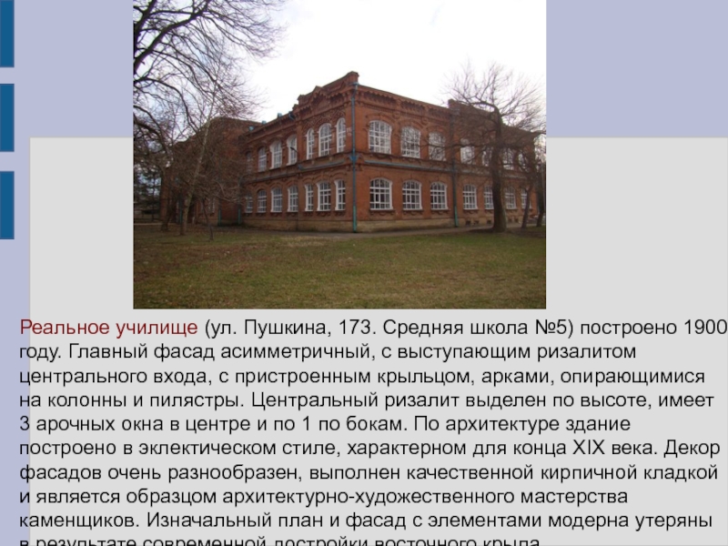 Слайд 16Реальное училище (ул. Пушкина, 173. Средняя школа №5) построено 1900 году.