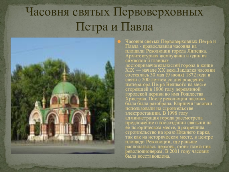 Слайд 6Часовня святых Первоверховных Петра и Павла