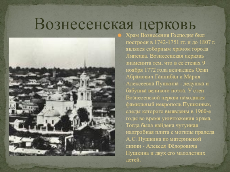 1807 г. являлся соборным храмом города Липецка. Вознесенская церковь знаменита тем, что в ее стенах 9 ноября 1772 года венчались Осип Абрамович Ганнибал и Мария Алексеевна Пушкина - дедушка и бабушка великого поэта. У стен Вознесенской церкви находился фамильный некрополь Пушкиных, следы которого выявлены в 1960-е годы во время уничтожения храма. Тогда была найдена чугунная надгробная плита с могилы прадеда А.С. Пушкина по материнской линии - Алексея Фёдоровича Пушкина и двух его малолетних детей.