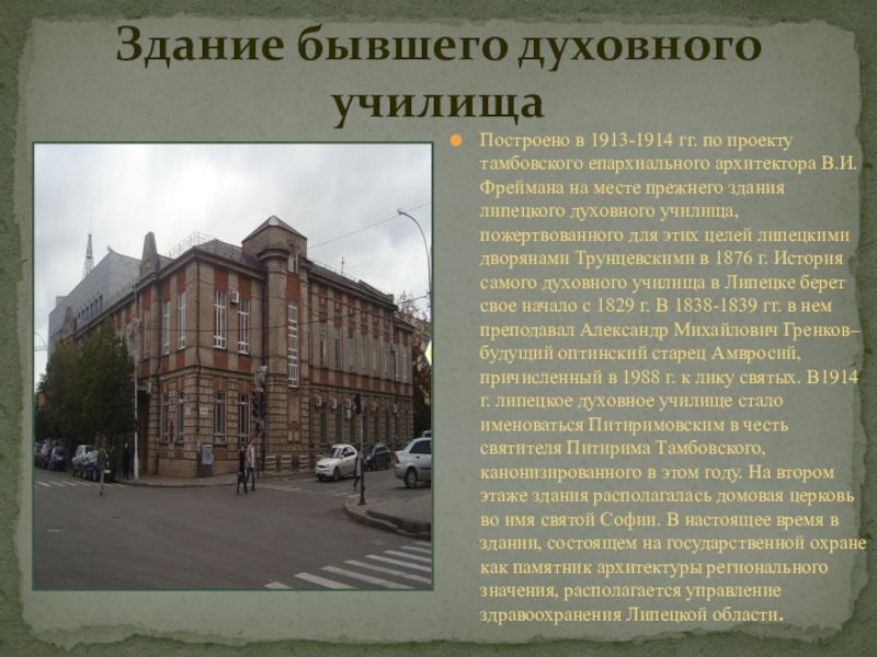 архитектора В.И. Фреймана на месте прежнего здания липецкого духовного училища, пожертвованного для этих целей липецкими дворянами Трунцевскими в 1876 г. История самого духовного училища в Липецке берет свое начало с 1829 г. В 1838-1839 гг. в нем преподавал Александр Михайлович Гренков– будущий оптинский старец Амвросий, причисленный в 1988 г. к лику святых. В1914 г. липецкое духовное училище стало именоваться Питиримовским в честь святителя Питирима Тамбовского, канонизированного в этом году. На втором этаже здания располагалась домовая церковь во имя святой Софии. В настоящее время в здании, состоящем на государственной охране как памятник архитектуры регионального значения, располагается управление здравоохранения Липецкой области.