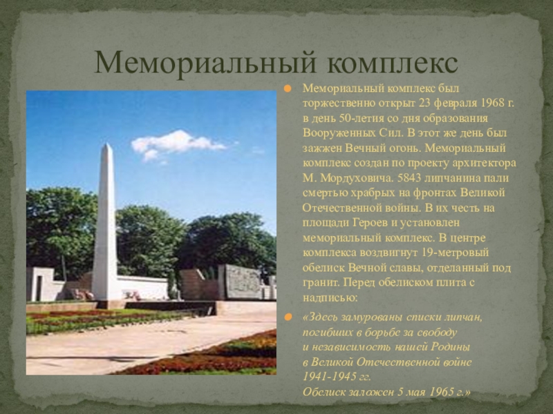 день 50-летия со дня образования Вооруженных Сил. В этот же день был зажжен Вечный огонь. Мемориальный комплекс создан по проекту архитектора М. Мордуховича. 5843 липчанина пали смертью храбрых на фронтах Великой Отечественной войны. В их честь на площади Героев и установлен мемориальный комплекс. В центре комплекса воздвигнут 19-метровый обелиск Вечной славы, отделанный под гранит. Перед обелиском плита с надписью: