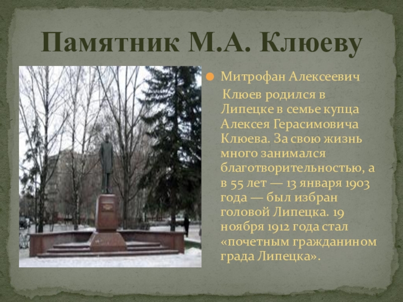 купца Алексея Герасимовича Клюева. За свою жизнь много занимался благотворительностью, а в 55 лет — 13 января 1903 года — был избран головой Липецка. 19 ноября 1912 года стал «почетным гражданином града Липецка».